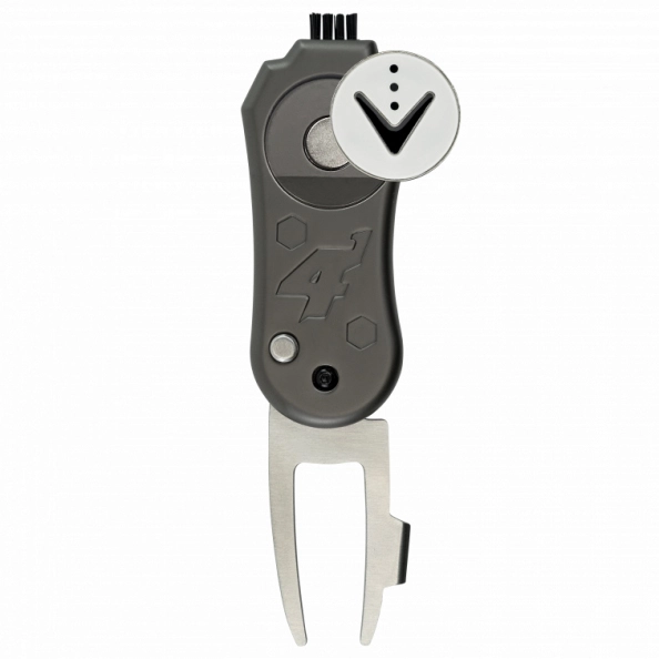 Callaway deluxe 4 in 1 blade divot tool is a multi purpose tool that all golfers must have with them on the course. Comes in a chrome stylish design and is made from a durable zinc alloy to last. 4 main features are divot tool, magnetic ball marker, club brush & groove cleaner.
