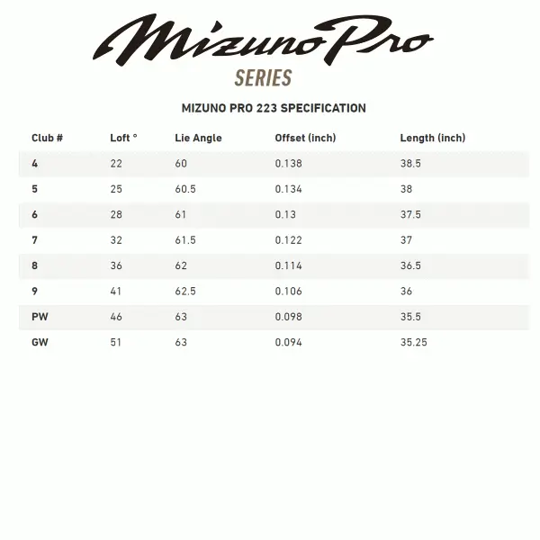 Introducing The Mizuno Pro 223 Irons the compact players cavity designed for elite players and tour professionals, but feature a completely new piece of technology that grants added distance for demanding, extended course layouts. The aforementioned technology comes in the form of the irons’ forged Chromoly construction and Flow Micro-Slot, which results in an extremely thin, flexible face that generates extreme ball speeds. In fact, the Pro 223 boasts a thinner face than its players distance relative, the JPX 921 Forged. While distance is a boon in longer irons, great players seek precision and control in their shorter irons and wedges. As such, the Pro 223’s eight iron through pitching wedge are crafted using the same one-piece Grain Flow Forged 1025E Pure Select mild carbon steel construction as the muscleback Pro 221.